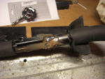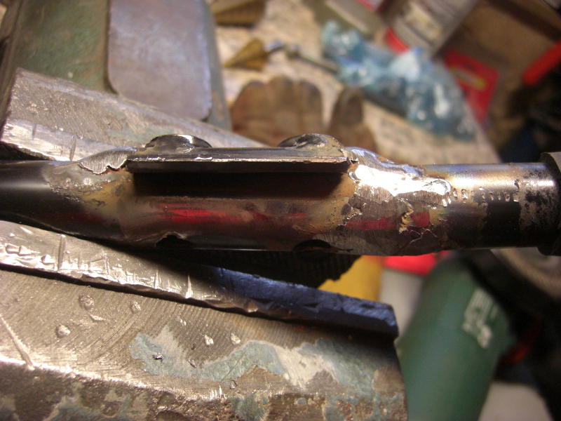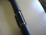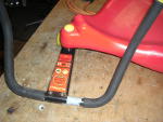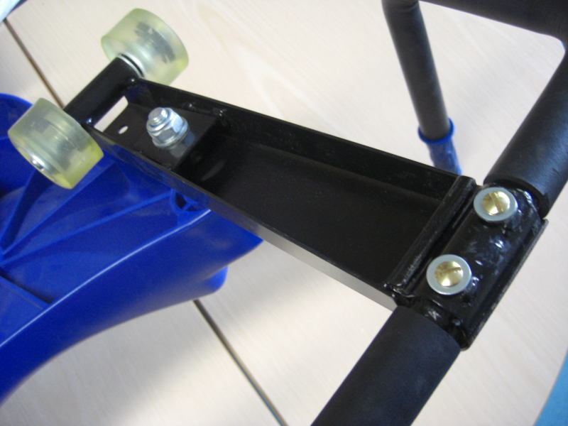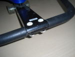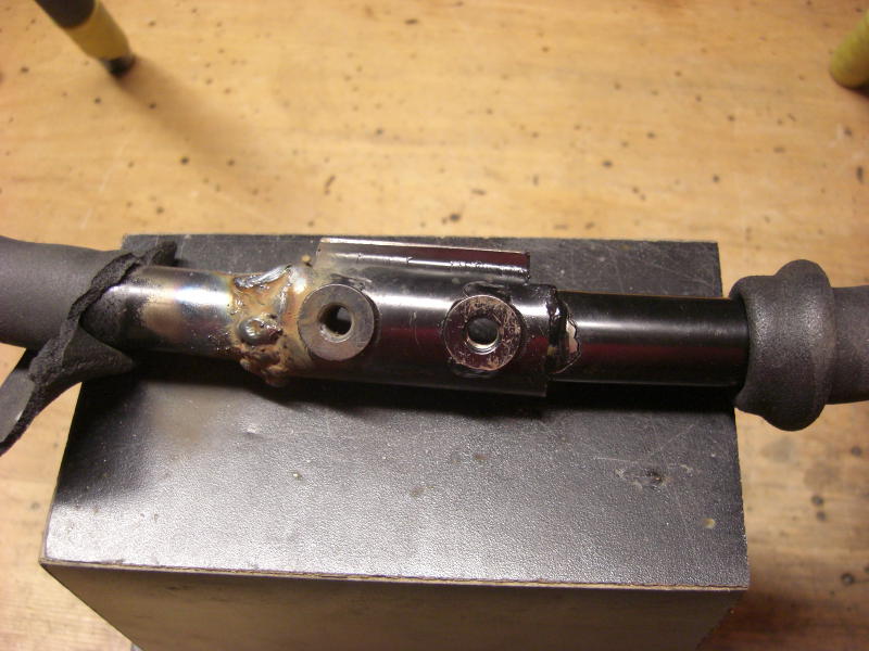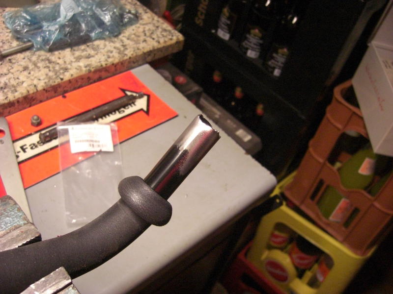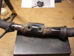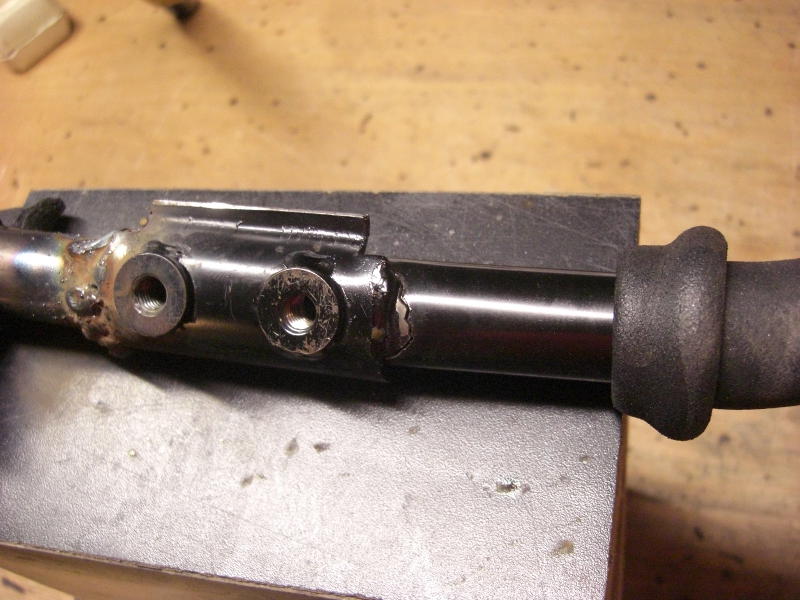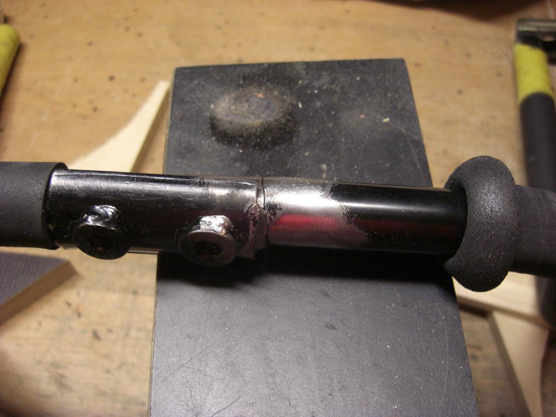 Die nächste Ausführung war vom Hersteller schon verbessert, es gab feste Gewinde im Lenkerteil. Bei diesem Roller war jedoch das Problem, daß eine der beiden Lenkstangen abgebrochen war. Die zweit war auch bereits angebrochen. Hier half nur Schweißen, nachdem der Lack um die Schweißstelle mit einem Winkelschleifer mit Zopfbürste abgetragen wurde. Nach dem Schweißen wurde die Lenkstange mit einer Schruppscheibe noch etwas schick gemacht und Rostschutzfarbe ergänzte die Arbeit.
