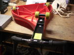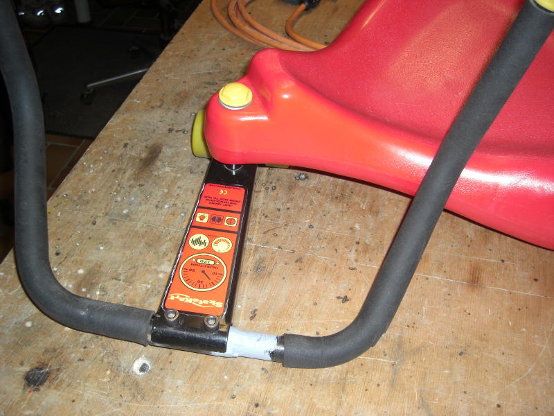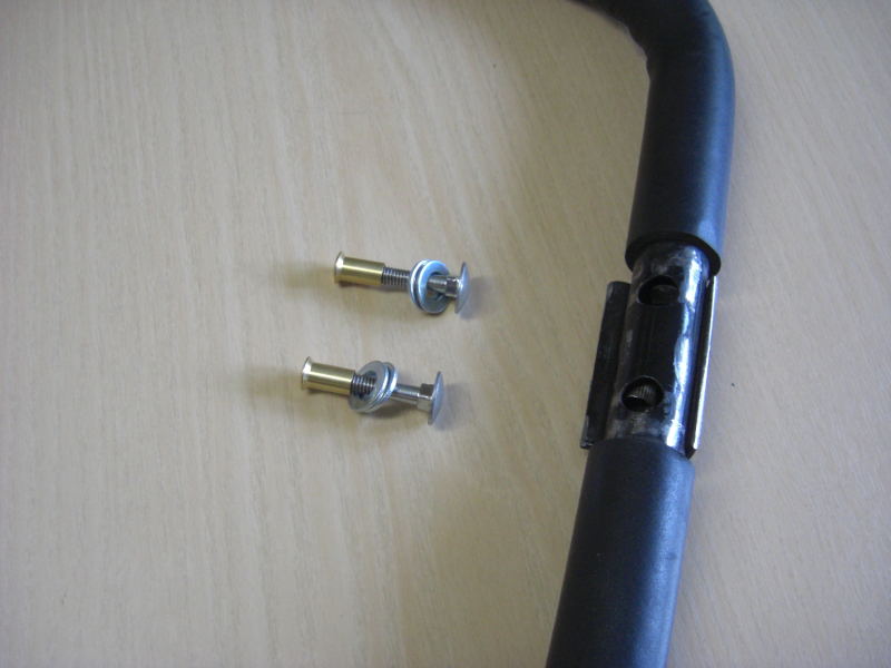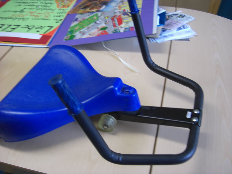 Hier sitzt der kleine Rennfahrer auf dem blauen Sitz, hat seine Füße auf den Querrohren des Lenkers und kann nun durch Schwingen an den Griffen, das Fahrzeug in Bewegung setzen und halten. Der Lenker ist mit dem vorderen Fahrschemel mit zwei Schrauben verbunden. Die Leiterin beschrieb mir das Problem, daß dieses Fahrzeug defekt sei und niemand könne das reparieren. Niemand ? Ok, Tasche gepackt und hin. Der Lenkerteil hatte sich vom Chassis gelöst und eine Befestigungsschraube war verlorengegangen. Das Besondere an den Befestigungen war die Verwendung von Hülsenmuttern, denn die Verschraubung durfte unten nicht herausstehen, damit beim Fahren der Bodenbelag nicht beschädigt wird. Mal schauen, was so in der Werkstatt ist. Zunächst fand ich Schrankverbinder mit Hülsenmuttern, verschraubte das Ding und lieferte. Nach Auskunft der Leiterin hielt die Lösung exakt eine halbe Stunde der Rasselbande stand. Immerhin. Der nächste Versuch erfolgte mit härteren Schrauben, Hülsenmuttern ( bekam sie erstmal nur aus Messing ) und Gewindesicherungsmittel (Loctite). Habe seitdem nichts mehr gehört. Mal sehen, wie es beim nächsten Besuch aussieht.