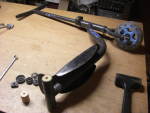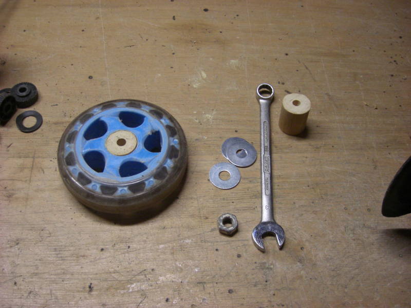 Argh, schon wieder diese Kunststoffkappen ! Also Hinterachse zerlegen und ein Rundholzstück von der Länge der Hinterachse anfertigen ( D: 27mm, L: 140mm, Bohrung 8,5mm ) und in das Querrohr eintreiben. Die Räder werden auch mit Rundholz ausgebüchst ( D: 27mm, 3mm abdrehen auf 6mm Länge pro Seite des Rades, Bohrung 8,5mm ). Dabei kann man hier mit einem Fein-Multimaster prima abstechen. Bei der Montage werden die Räder noch mit M10-Muttern zum Chassis distanziert und ein Satz neue Griffe vervollständigt die Reparatur. Deluxe Reparateure können die Bohrung des Rundholzstückes der Hinterachse auf 10mm erweitern und Stahlrohrstücke einpressen. Ist hier aber nicht geschehen.