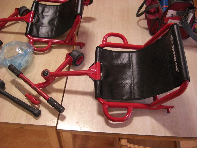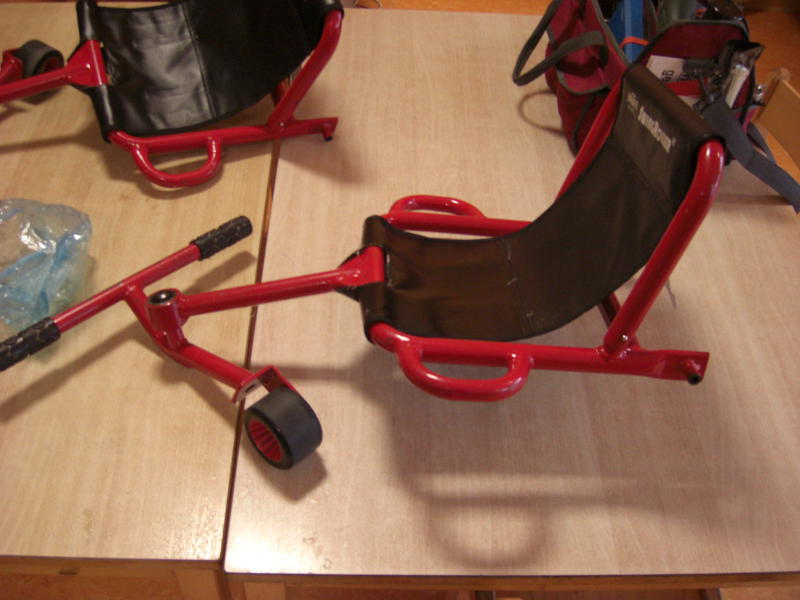 Der Roller besteht aus einem Stahlrohrchassis, an dem hinten zwei Räder angebracht sind, vorne ein Gelenk für das dritte Rad. Die Räder bestehen aus Kunststoff und sind mit je zwei Kugellagern mit innerem Distanzstück gelagert. Der Pilot sitzt vor den Hinterrädern und legt seine Füße auf die Lenkstange vorne. Die Hände können sich seitlich an zwei Stahlbögen abstützen, die mit dem Chassis verschweißt sind. Durch abwechselnden Fußdruck auf den Lenker setzt sich das Fahrzeug in Bewegung. Zwei Fahrzeuge galt es für einen Kindergarten zu reparieren. ALLE Verschraubungen waren locker, Hinterräder waren abgefallen. Glücklicherweise hatte das Team alle Teile aufgesammelt und in eine Tüte gesteckt. Somit war die Montage einfach und die Verschraubungen wurden zusätzlich mit Loctite 243 gesichert.