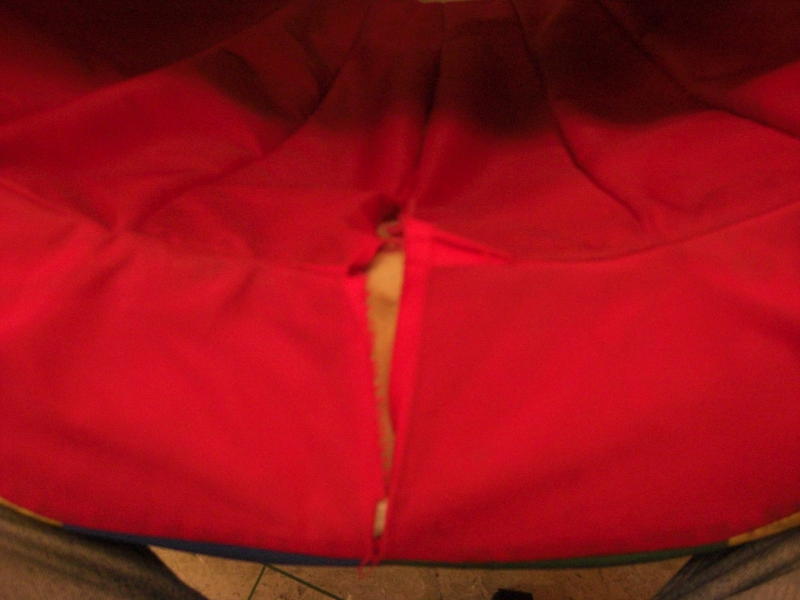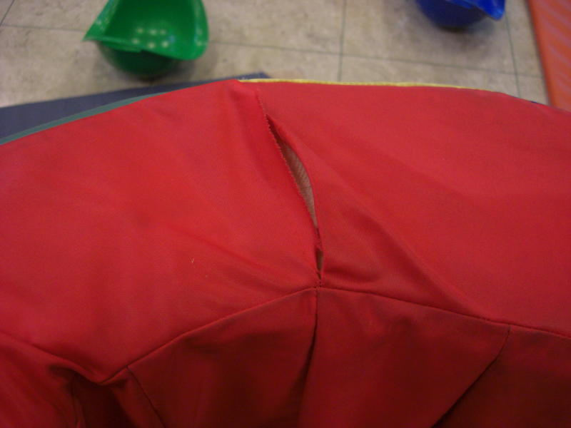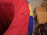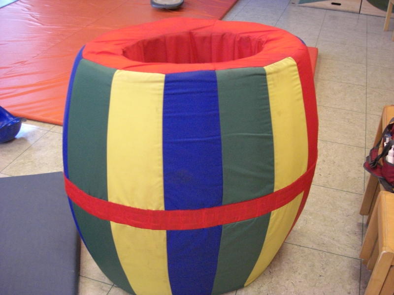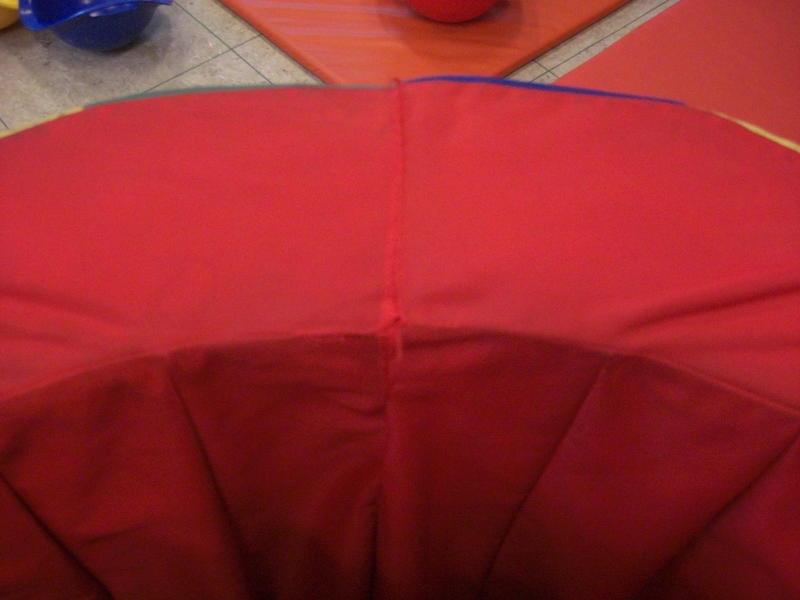 Dieses Spielzeug fand sich in einem Turnraum. Das Ding ist aus Schaumstoff mit Kunstfaserbezug. Einige Nähte waren aufgegangen. Beim nächsten Besuch waren also Nadel und Polyesterfaden dabei und nach einer Stunde Näharbeit war es wieder zusammen.