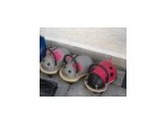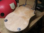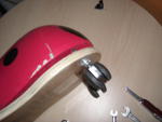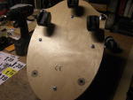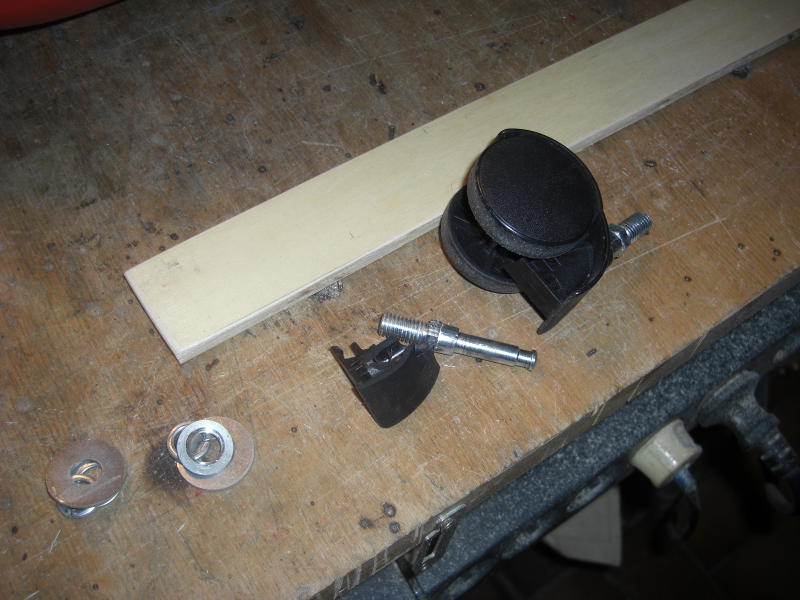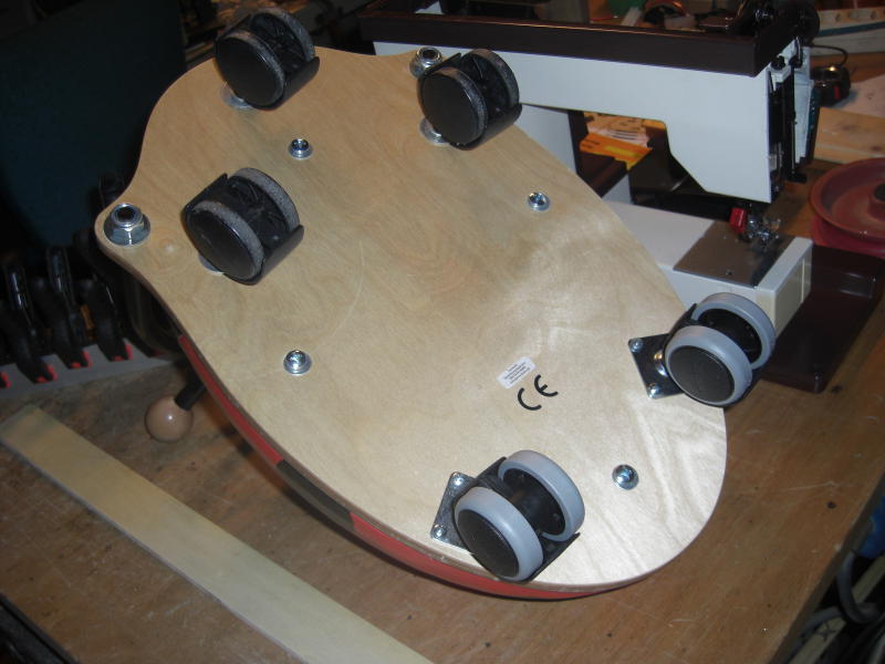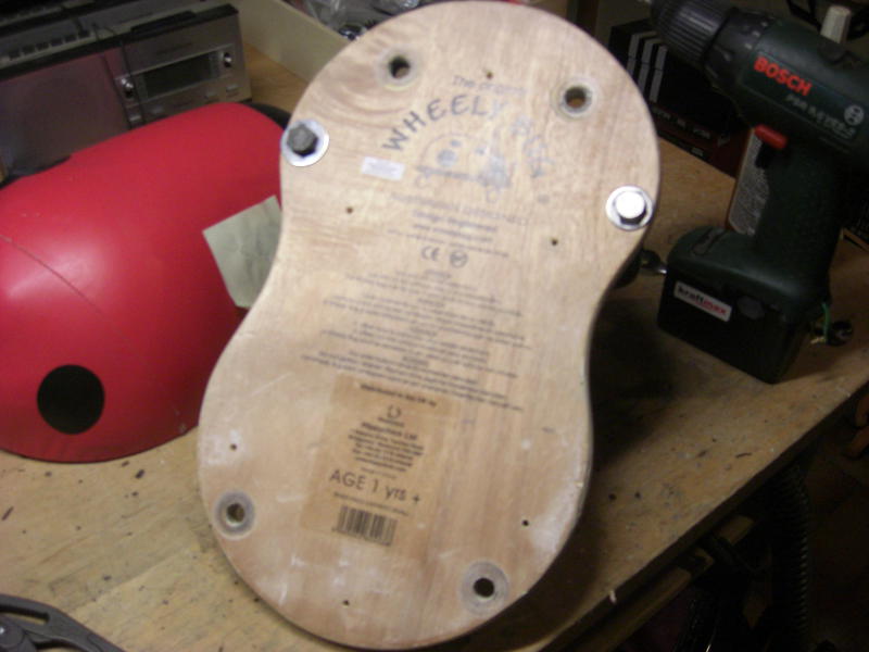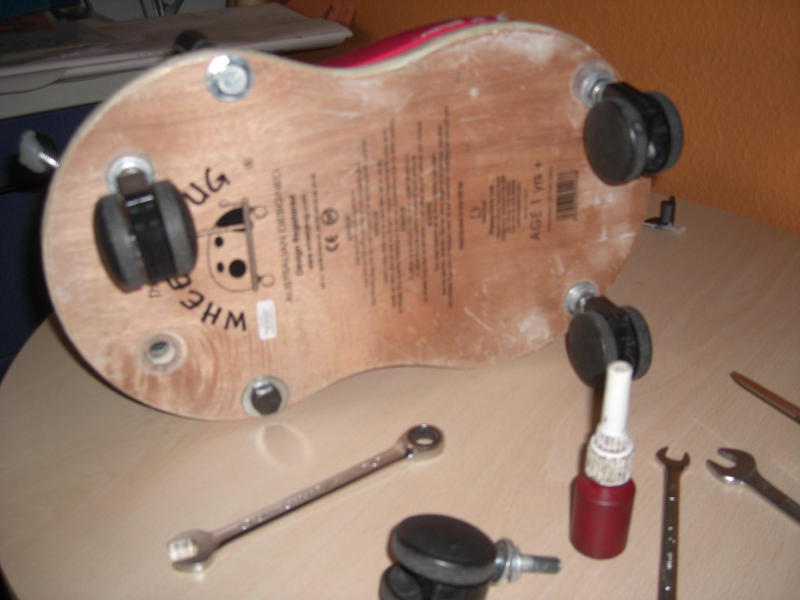 So, hier weitere Infos, denn ein WheelyBug kam wieder zur Reparatur. Die vier Rollen sind über ihr Gewinde mit dem Sitzkörper verbunden, da dort Kunststoffhülsen mit eingesetzten Gewindestücken für die Aufnahme der Rollen vorgesehen sind. Hier waren nun drei der vier Kunststoffhülsen gebrochen und die Rollen waren herausgefallen. Die Lösung war, die Rollen zunächst mit dem Sperrholzbrett zu verschrauben und dann das Oberteil auf das Brett zu schrauben, nachdem die Rollenaufnahmen soweit aufgebohrt wurden, daß auch die Mutter darin Platz hat. Dabei wurden diese Befestigungsschrauben mit Leim versehen, damit sie nicht herausfallen.