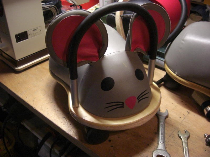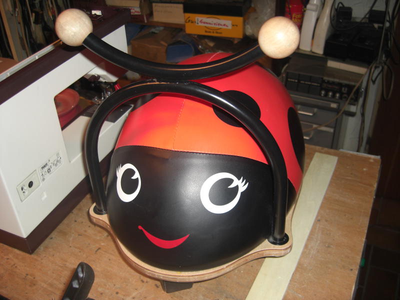 Dieses Fahrzeug ist für die jüngeren Piloten in der Kindertagesstätte. Der Hersteller reklamiert ein australisches Design, hergestellt wurde es in China, vertrieben wird das Teil hier durch die Unicorn GmbH, info@unicorn-toy.de Ein echtes Produkt der Globalisierung. Daher rührt wohl auch die Tatsache, daß das Fahrzeug mit zölligen Komponenten aufgebaut ist und nicht metrisch. Bedeutet eigentlich nur, daß man keine Teile verlieren sollte, denn deren Beschaffung ist hier eben etwas schwieriger, als in Australien. Sei's drum. Der Rutscher besteht aus einem Sperrholzbrett, auf dem ein tierkörperförmiges Kissen befestigt ist, auf dem das Kind sitzen kann. Ein Bügel aus Leichtmetall, befestigt mit zwei Bolzen, ermöglicht das Abstützen. Unter dem Sperrholzbrett sind vier Rollen aus dem Möbelbau befestigt, damit die wilde Fahrt vorankommt. Die Bugs, die zur Reparatur kamen, waren unvollständig und instabil. Beim Haltebügel ist das kein Wunder, eine Verschraubung durch Sperrholz wird sich ohne spezielle Sicherung mit der Zeit immer lockern, da das Holz nachgibt. Zunächst wurden die Bolzen und Rollen ausgebaut und mit dem Gewindesicherungsmittel Loctite 243 wieder eingesetzt. Die fehlende Befestigungsschraube eines Bügels wurde durch einen metrischen Bolzen ersetzt, nachdem das Gewinde im Bügel umgeschnitten wurde. Dies ist bezüglich der Belastungsmöglichkeit nicht optimal, aber es hält. Ein Fühler der Marienkäfervariante dieser Fahrzeuge war teilweise verloren gegangen. Die verbliebene Kugelschale wurde mit Heißleim aufgefüllt.