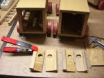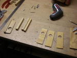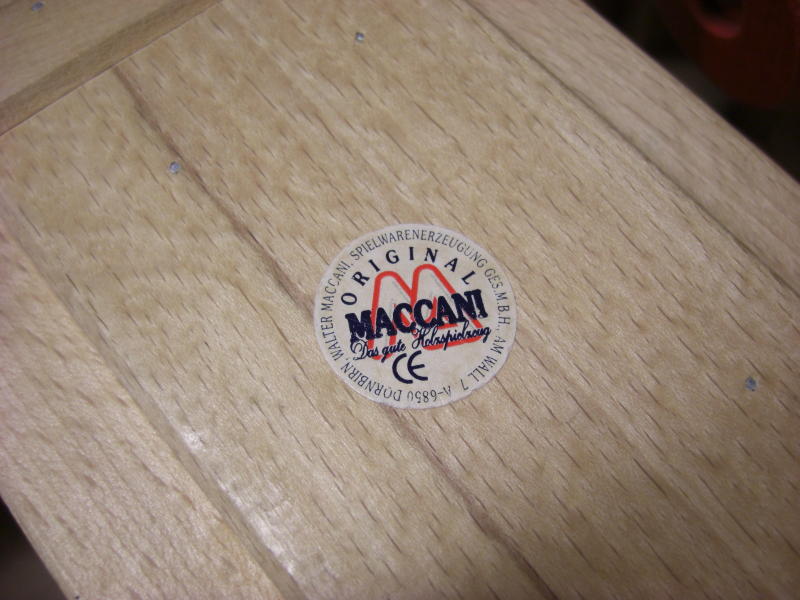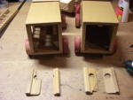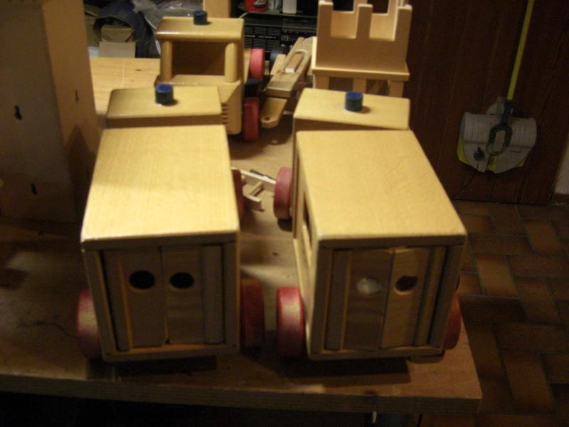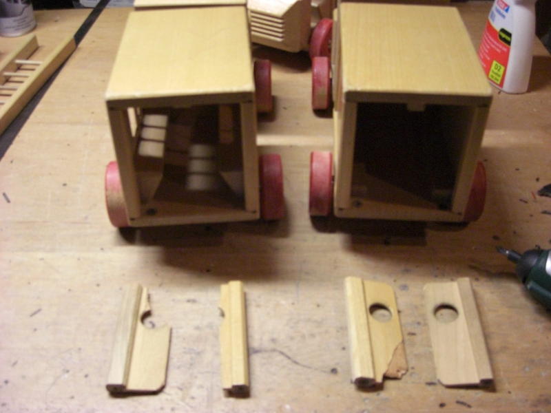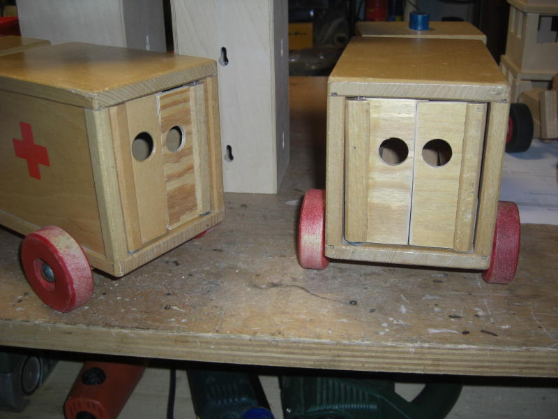 Das Lastwagenmodell ist sehr solide aus Buchenholz hergestellt. Das Führerhaus ist zum Lenken drehbar um die Chassisplatte angebracht. Der Drehpunkt ist eine Holzschraube, die von unten eingesetzt ist. Die Räder bestehen aus Holzscheiben. Drei Lastwagen waren zu reparieren, sie hatten einen Kastenaufbau mit jeweils zwei Türen am Heck. Die Türen sind oben im Kastenaufbau mit einem Stift gesichert, unten mit einer Schraube, die durch den Kastenaufbau geführt ist. Die Türen selbst bestehen aus einem Buchenholzprofil, in das das Türblatt aus Sperrholz eingeleimt ist. Die Türblätter waren zerbrochen oder fehlten. Zunächst wurden neue Türblätter aus Sperrholz angefertigt. Die Fensteröffnungen wurden mit einem 20mm Forstnerbohrer hergestellt, wobei die Türblätter im Paket gebohrt wurden. Nun wurden die Reste der Türblätter aus den Rahmenholmen mit einem feinen Schraubenzieher entfernt. Dann wurden die Türblätter in die Holme geleimt und mit einem Schraubstock eingepreßt. Anschließend wurden die Türen wieder in den Kastenaufbau eingesetzt. Abschließend wurden noch die Schrauben für's Lenken frisch eingeklebt und so justiert, daß das Fahrerhaus nicht durchhängt.