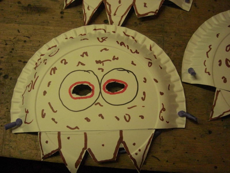 Unser Enkel ist nun zwei Jahre alt und geht in eine Spielgruppe. Hier bereiteten sich alle auf Fasching vor und eine Verkleidung mußte her. Wie wäre es mit Masken? Und wie herstellen? Nunja, da waren doch noch diese Pappteller da, etwas elastisches Band und Filzschreiber. Und so gab es was für die kleinen Füchse und die kleinen Monster (selbstverständlich keine Verbindung zur Realität).;-))