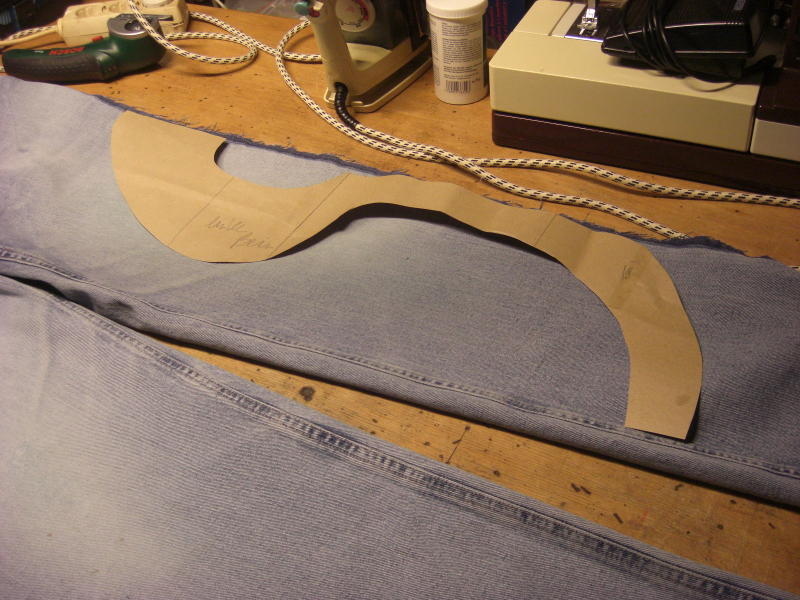 Ja, wenn man nicht so freizügig durch die Gegend turnen darf, nach Möglichkeit nur mit Maske, dann kommt man schon mal auf Ideen. Ich könnte doch mal meine Jeans durchsehen und sie ausbessern. Sie sind zum Teil schon dreißig Jahre alt und da wird der Stoff an den Oberschenkeln mit der Zeit doch recht dünn. Nunja, solche Jeans gibt es sogar zu kaufen, die Anbieter arbeiten mit viel Aufwand Schleifstellen und Löcher in den Stoff ein und der Träger gaukelt vor, diese Jeans schon Jahrzehnte zu tragen. Modisch ist das auch, die Gemeinde liegt ihm vor Bewunderung zu Füßen. Jetzt komme ich aber aus einer Generation, wo ein solches Beinkleid einfach nur als unordentlich empfunden wird. Also was anderes machen. Vielleicht die Ausbesserung mit einem Thema austatten. Drei Jeans habe ich gefunden, die es nötig hatten. Allen gemein ist, daß die linke Seite der Hose im Bereich der Oberschenkel zunächst mit einem Bügelflicken stabilisiert wurde. Diese Flicken gibt es für kleines Geld mit einem Maß von 47 x 15 cm. Um das aufzubringen, muß jeweils eine Seitennaht der Hosenbeine aufgetrennt werden. Die Beine sind auf der Innenseite mit einer Kappnaht verbunden, auf der Außenseite mit einem Kettenstich und die beiden Lagen dann mit einer Overlocknaht versäubert. Diese Seite bot sich zum Auftrennen an. Von anderen Arbeiten an Hosen weiß ich, daß das Gewebe der Flicken recht dünn ist und gerne reißt, wenn sie innen im Bereich z.B. der Knie aufgebracht werden.Außerdem lösen sie sich, wenn die Hose im Laufe der Zeit häufiger gewaschen wurden. Also würde ein anschließendes Vernähen der Flicken mit dem Originalstoff das Problem lösen. Auch aus diesem Grunde sind die Entwürfe zu sehen.