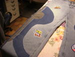 Zweiter Entwurf, XY: Zufällig kam in dieser Zeit die Sendung XY-ungelöst im Zweiten Fernsehen und damit die Idee, ein XY-Motiv zu machen. Es fand sich noch Jeansstoff in dunkelblau für die Flicken im Kniebereich. Um einen weiteren Effekt zu erzielen fand ich bei einem Auktionshaus reflektierenden Stoff, der dort für etwa 4€ angeboten wurde (140 x 50cm). Damit könnte man das X und Y doch ein wenig betonen. Naja, und in der Dunkelheit gibt das auch etwas mehr Sicherheit. Aber wie kriege ich das Bild rund ? Vielleicht mit Aufbügelmotiven. Hier gab es eine Serie von einer Näherin, die Polizeimotive auf Aufbügelfilz aufnäht. Nett arrangiert, aufgebügelt und anschließend vernäht. Die Hose wurde anschließend an den Seitennähten mit Dreifach-Geradstich gebunden und anschließend mit einem Overlockstich versäubert. Und so sind Polizist und Kollegin mit Auto dem Bösen Buben hinterher.