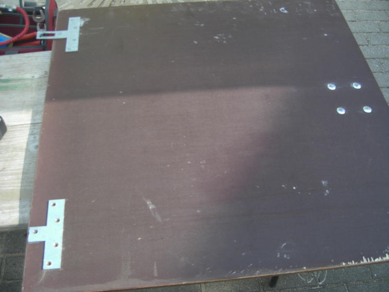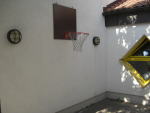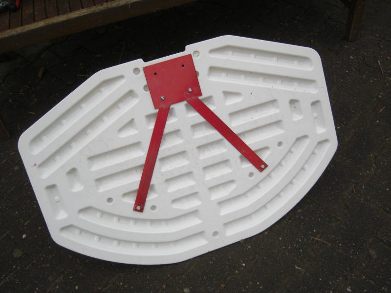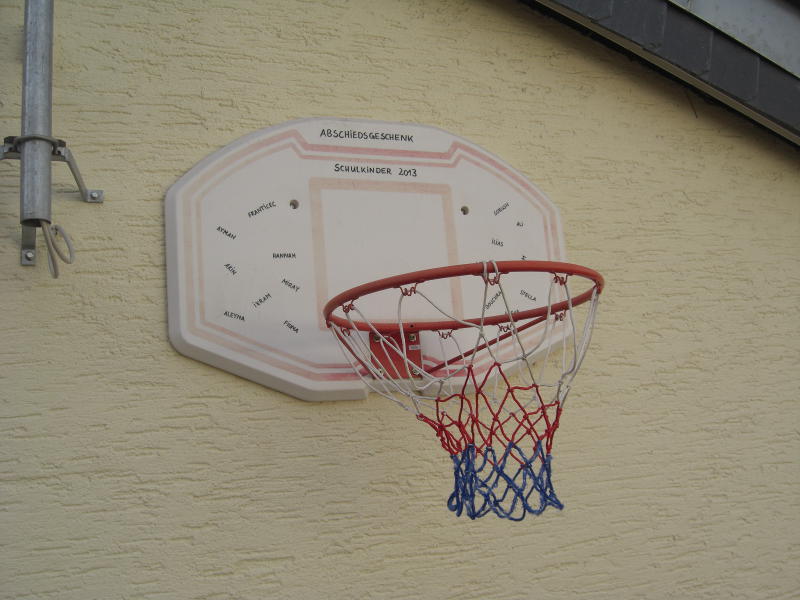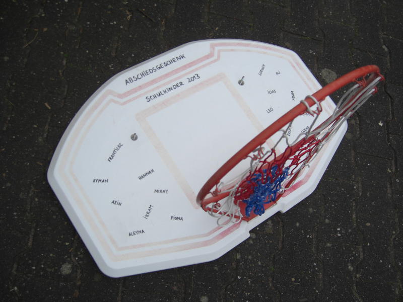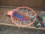 Dann war ein Basketballkorb von der Wand gebrochen. Wenn man nun das kaputte Blech dreht, eine Öffnung für den Haken einarbeitet, dann könnte doch, passend für die Haken... Hat geklappt. Damit der Korb sich nicht wieder so ohne weiteres löst, wurden in Korbhöhe zwei weitere Schrauben verwendet.