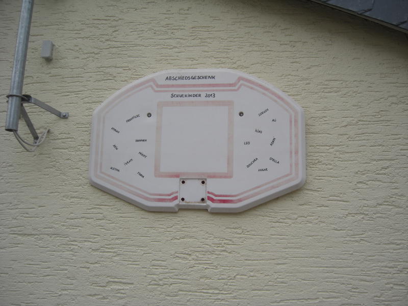 Der nächst Korb war einem Kindergarten von einem Jahrgang geschenkt worden, der die Kita in Richtung Schule verließ. Irgendwelche Vandalen hatten den Korb abgerissen, es galt ihn wieder stabil an die Wand zu bekommen. Wenn man sich das so anschaute, dann war da der Korb, die Kunststoffverkleidung und ein Blech drunter. Würde ich den Korb wieder nur an der Wand verschrauben, wäre das nicht stabil. Also wurde der Korb oben mit M6-Schrauben an das Blech geschraubt, die unteren beiden Schrauben kamen in die Wand. So fängt das Blech das Biegemoment ab, wenn sich wieder jemand an den Korb hängt.
