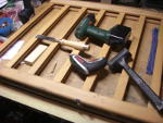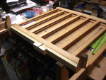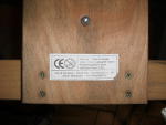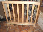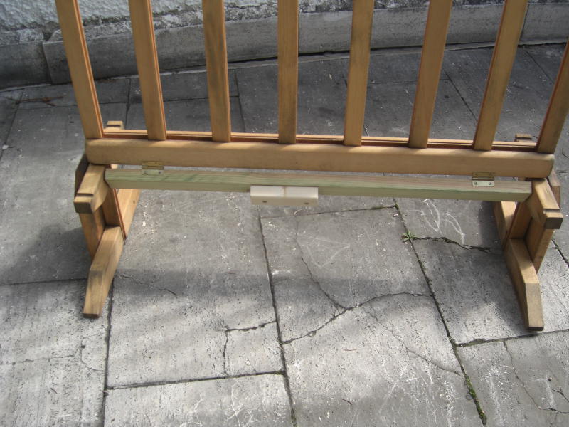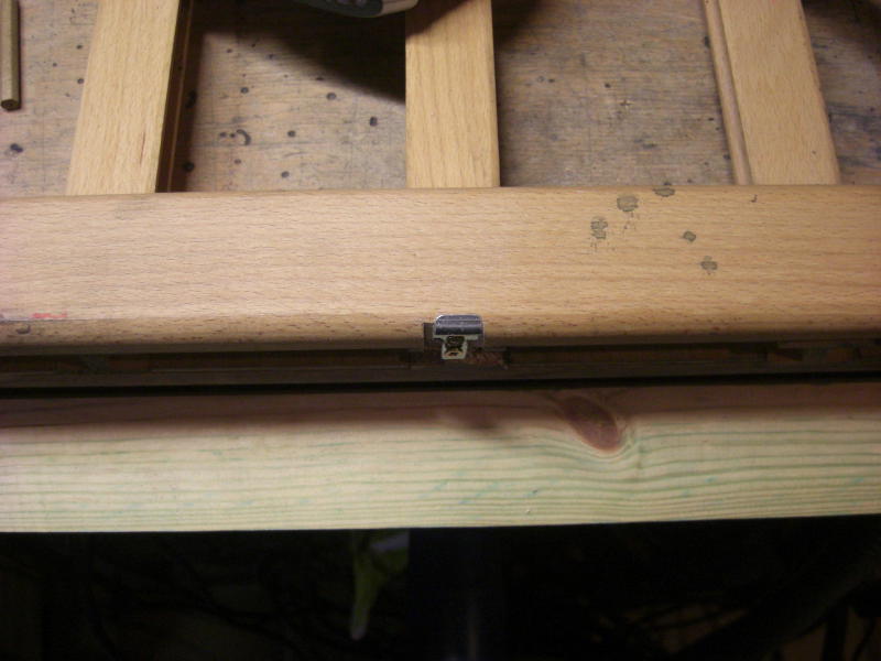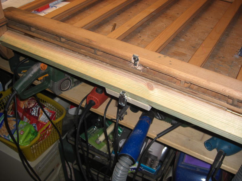 Das Spiel besteht aus einem Holzgestell, in das Schächte für die Spielscheiben eingearbeitet sind. Die Spielscheiben werden von den Spielern eingeworfen, wer eine Reihe von vier Spielscheiben seiner Farbe erreicht, hat gewonnen. Dafür müssen die Schächte unten für das Spiel verschlossen werden. Dies ist vom Hersteller mittels zweier runder Holzstäbe mit einer Kugel am Ende vorgesehen. Zieht man diese, so fallen die Spielscheiben wieder heraus. Leider ließen sich die Stangen auch komplett entnehmen, so daß sie in dem Kindergarten verloren gingen. Also mußte etwas her, um dieses Manko auszugleichen. Die Wahl fiel auf ein Stück Dachlatte, das den passenden Querschnitt von 44x24mm hatte. Auf der einen Seite wurde sie mit zwei Scharnieren befestigt, auf der anderen Seite wurde ein Kistenverschluß verwendet. So kann hier nichts mehr verlorengehen, mal hoffen, daß die Kinder nicht entdecken, daß man mit den Spielscheiben prima Shuffleboard spielen kann.