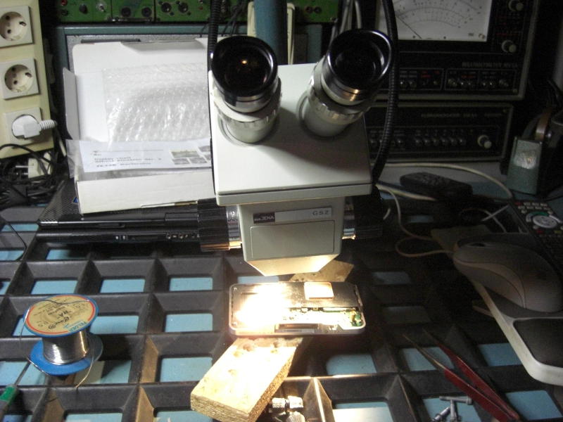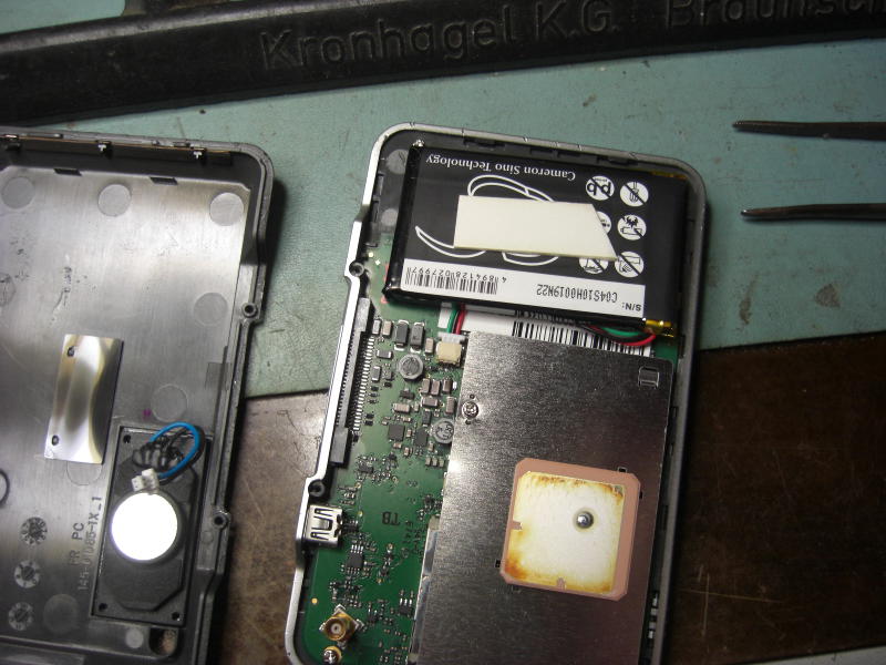 Das Navigationssystem gehört einem Bekannten und der Akku wurde mit der Zeit schwächer. Nun gibt es für kleines Geld passende Ersatzakkus bei einem großen Internet-Auktionshaus und der Bekannte schlug zu, um ihn auszuwechseln. Dies mißlang, da beim Öffnen des Gerätes, das mit Kunststoffzungen zusammengehalten wird, die Buchse der Akkusteckverbindung von der Platine gerissen wurde. Kann passieren, da der Akku auf beiden Seiten mit der Ober- und Unterschale verklebt ist. Und so bekam ich das Gerät auf den Tisch. Um besser arbeiten zu können, kam ein Stereo-Auflichtmikroskop zum Einsatz, denn die Abmessungen der Bauteile und die Strukturen sind inzwischen doch schon recht winzig geworden. Mit ruhiger Hand und einer Bleistiftspitze für den Lötkolben ließ sich das Problem dann lösen. Dabei mag es vielleicht erstaunen, aber am Besten läßt sich sowas mit einen geregelten Lötkolben ( hier eine Weller 50W-Station ) lösen. Es braucht keinen 10W Lötkolben, da die Dinge so klein sind. Zügiges Arbeiten vorausgesetzt. An diesem Gerät habe ich auch gelernt, daß es unterschiedliche USB-Kabel gibt und nach einiger Suche fand ich eines, das die Elektronik überredet hat, den Akku zu laden.