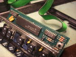 An die Schaltkreise kommt man ran, indem man das Display ausclipst und hochbiegt und das untere Plastikteil mit einem Zahnarztfräser vorsichtig neben dem Display abtrennt. Der Baustein rechts neben dem SC75518N (74LS96) ist für die fünf LEDs des Bedienteils links an der Maschine zuständig.