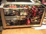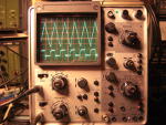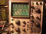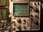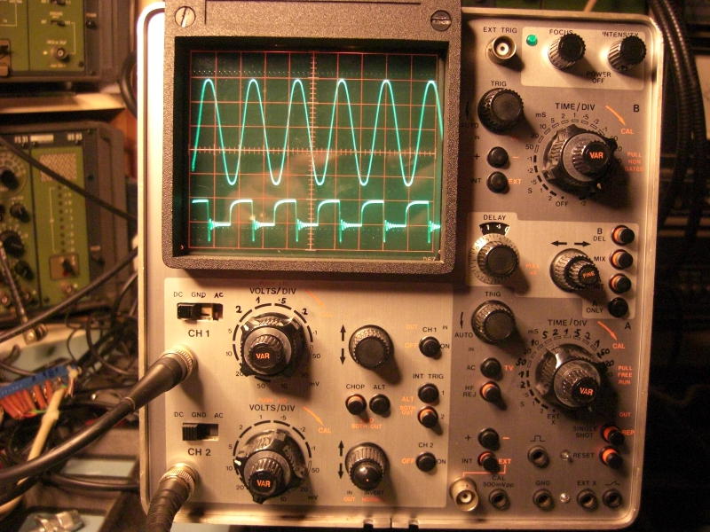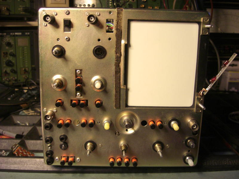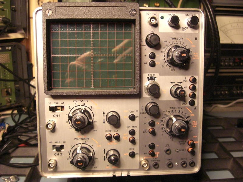 Das Oszilloskop ist solide aufgebaut und hat eine gute Ausstattung, daher kaufte ich eines im Jahre 1980. Bei einem Auktionshaus im Internet sah ich im Frühjahr 2016 ein baugleiches Modell, völlig verdreckt aber vollständig. Beim ersten Durchlauf interessierte sich niemend für dieses Gerät und als es erneut eingestellt wurde, bot ich kleines Geld und das Gerät kam gut verpackt hier an. Es ließ sich einschalten und ein Signal erschien.....nur auf Kanal 2. Regler und Schalter hatten Aussetzer. Ok, ein Rundumschlag war notwendig. Erstmal zerlegen: Griff ausbauen, Seitenwände abnehmen. Rahmen an der Anzeigeröhre abschrauben, Vorderrahmen abnehmen. Dann alle Knöpfe abnehmen ( Die meiste Zeit hat wohl das Suchen des passenden Inbus-Schlüssels gebraucht). Dann die Frontplatte entfernt. Alle abgenommenen mechanischen Teile kamen in eine Wanne mit lauwarmer Seifenlösung und zeigten mit der Zeit ein Gesicht, das mir bei diesem Gerät schon bekannter war. Die Knöpfe wurden mit einer Handwaschbürste geschrubbt und das Aluminium poliert. Das sieht zwar kein Mensch, aber es macht Spaß, die Knöpfe dann so wieder zu montieren. Es stellte sich dann heraus, daß zunächst der Betriebsartenwahlschalter (Schiebeschalter, 3 Positionen, S901) stark korrodiert war und nicht mehr mit Kontaktspray wiederzubeleben war. Eine Suche im Netz brachte mich zu einem Bastler in England, der das Problem mit einem Schalter einer Gitarre lösen konnte. Der englische Anbieter rief für Schalter und Porto einen heftigen Tarif auf, so daß ich nach einer anderen Lösung suchte. Beim Musikhaus Thomann in Burgebrach wurde ich fündig, sie bieten einen Hosco SON-OFF-ONB Schalter für Mustang Style Guitars an, der das macht. Allerdings ist dieser etwas größer als das auszuwechselnde Teil, so daß Frontchassis und neuer Schalter nachgearbeitet werden mußten. Dabei kommt man an den Schalter dann gut ran, wenn man die Baugruppe mit dem Spannungswahlschalter mechanisch löst, dann ablötet und etwas nach hinten zieht. Der Schalter wurde eingebaut und weitere Messungen zeigten, daß der erste und der zweite Kanal unterschiedliche Werte bei gleichem angelegten Signal zeigten. Etwas messen brachte es an den Tag, der Widerstand R901, der am Eingang des ersten Kanals sitzt, hatte seinen Widerstandswert abnorm verändert. Man kann auch sagen, er hat einen Schlag bekommen. Der Widerstand (1MOhm) war schnell ersetzt und so ging es ans Zusammensetzen der Front. Die Frontplatte hatte Gebrauchsspuren, so daß der Aufdruck an einigen Stellen fehlte. Hier half ein edding permanent Filzschreiber mit 0,6mm Strichbreite weiter. Der Wartungs-Abgleich ließ sich gut an, auch deshalb, da eine vollständige Bedienungs- und Wartungsanleitung im Netz verfügbar ist. Nur der Abgleich der Trigger A und B brauchte mehrere Anläufe, denn wenn man nicht genau arbeitet, dann stellt das Gerät das Signal gerne zusammen mit der um 180 Grad gedrehten Version dar. Aber mit Geduld und …. Dann war das Gerät wieder fit. Hier ein paar Fotos:
