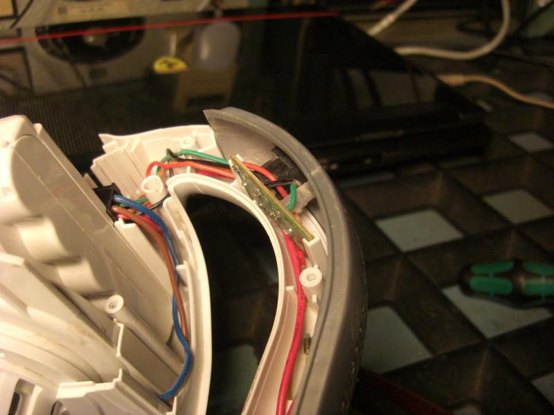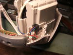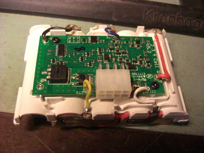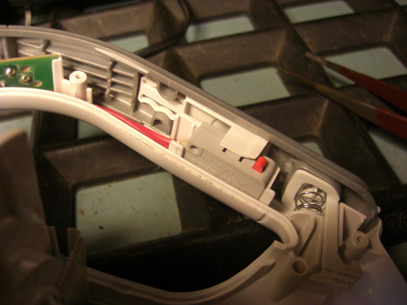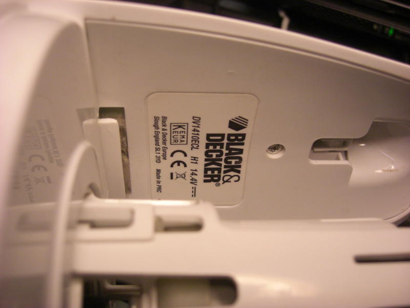 Der Staubsauger kam zur Reparatur, weil er nach Betätigung des Einschalters nicht mehr anlief. Es war ein Ladegerät dabei. Nach dem Einstecken blinkte eine blaue LED neben dem Anschluß und das Ladegerät nahm eine Leistung von 8,5W auf. Na bitte, Ladegerät und Zuleitung sind schon mal in Ordnung. Nach etwa 4 Minuten leuchtete die LED dauernd und die Leistungsaufnahme ging auf 0,5W zurück. Sieht so aus, als ob die Zellen geladen wären. Auf der einen Seite des Gehäuses des Staubsaugers sind eine Anzahl von Schrauben sichtbar, die alle gelöst und entnommen werden müssen. Nach entsprechender Fummelei entlang der Trennfläche der beiden Gehäusehälften gehen sie auseinander. Nun ist ein Paket sichtbar, das mit einer achtpoligen Verbindung an das Gerät angeschlossen ist. Die Hälften sind gerastet. Darunter liegen die vier Akkuzellen, die Ladeelektronik und die Schaltmimik. Bei den Zellen wurden je 4Volt gemessen, scheinen tatsächlich voll zu sein. Bei der Elektronikplatine war nichts Auffälliges, keine kalten Lötstellen oder sonstige Beschädigungen. Nach Ausbau der restlichen Elektronik aus der Gehäusehälfte kam auch der Einschalter zum Vorschein. Es ist ein Mikroschalter und Taster, der auf die Schaltmimik wirkt. Nach Einsprühen mit etwas Tuner600 Kontaktspray begann der Motor etwas zu zucken, wenn man fest auf den Taster drückte. Sieht so aus, als ob die Kontakte des Tasters durch den Gebrauch wohl verbrannt sind. Genaues Anschauen des Tasters zeigte, daß das Gehäuse nicht vernietet oder verklebt ist. Also Fuge der beiden Hälften gesucht und mit der Klinge von einem Taschenmesser reingedrückt. Die Hälften trennten sich und ein schwarzer Belag auf den Kontakten wurde sichtbar und bestätigte die Vermutung. Ein Kontakt ließ sich aus dem Gehäuse lösen, so war er einfacher zu reinigen (mit Glaspinsel). Der andere Kontakt im Taster wurde mit einer Taschenmesserklinge blankgeschabt. Nun wurde das Gehäuse des Tasters wieder zusammengesetzt und in die Gehäusehälfte des Staubsaugers eingesetzt. Nach Drücken des Tasters tobte der Motor los wie am ersten Tag. Nun wurden noch die Drähte in die Kanäle der Gehäusehälfte verlegt, die restlichen Kunststoffteile im Griff ergänzt und die beiden Gehäusehälften wieder verschraubt.