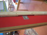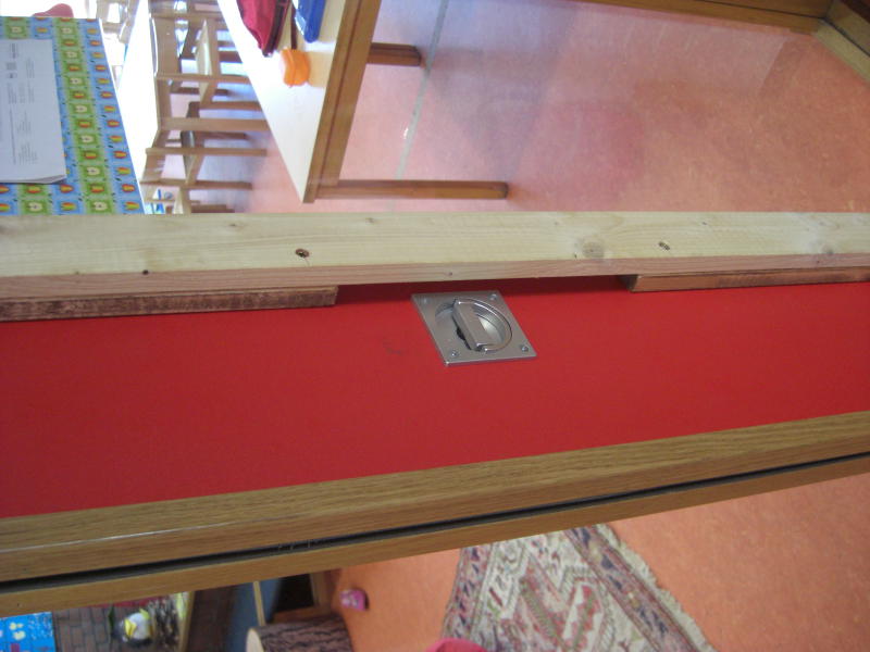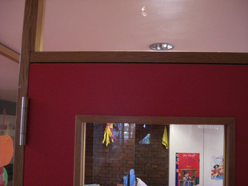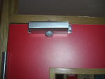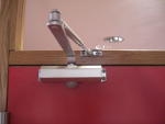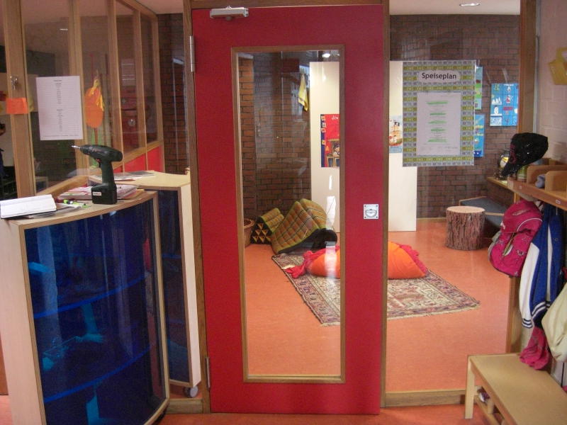 Die Leiterin einer Kita ärgerte sich über eine Tür. Sie führt vom Flur zur Kantine. Irgendjemand hatte sich für einen Drehverschluß entschieden, der von den Kindern nur schlecht zu betätigen war. Insbesondere dann, als das Schloß schwergängig wurde. Daraufhin sägte jemand den Schnapper des Schlosses ab. Nun ergab sich das Problem, daß die Tür nicht mehr schloss und da in der Kantine Fenster sind, die auch mal geöffnet werden, ging die Tür beliebig auf und zu. Jemand hatte versucht, dieses Problem mit Magnetschnäppern zu lösen, was jedoch nicht gelang, da sich keine geeignte Stelle für Schnäpper und Blech finden ließ.So fand ich die Tür vor und sollte mir was ausdenken. Ok, ein hydraulischer Türschließer wäre doch schon mal was. Nur ergab sich das Problem, daß die Kinder sich nicht die Finger klemmen sollten, wenn die Tür schließt. Die Tür war aus Holz und hatte eine Stärke von 40mm. Daher fiel die Wahl auf ein Brett, das 150cm hoch und 60mm breit war. Dieses wurde mit einem Unterbau von 25mm Breite montiert. In diesem Unterbau war eine Lücke, so daß man hier zugreifen und die Tür von der linken Seite des Brettes öffnen kann. Tests haben ergeben, daß die Kinder die Tür von außen öffnen können. Allerdings mit etwas Mühe. Auf der gegenüberliegenden Seite muß der Türspalt noch durch einen Fingerklemmschutz ergänzt werden, damit alles paßt. Dieser Klemmschutz funktioniert bis zu einem Öffnungswinkel der Tür von 120Grad, so daß auf der anderen Seite der Tür noch ein Anschlagpuffer notwendig wird. Der hydraulische Türöffner (Einstandspreis etwa 15€ bei einem Auktionshaus im Internet) wurde an den beiden Ventilen auf minimale Betätigungskraft und mäßiger Schließzeit abgeglichen. Das sieht in der Tat etwas rustikal aus, aber zum einen ist es sicher, zum anderen hilft ein passender Anstrich über den ersten Eindruck hinweg. Den wollte der Kindergarten vornehmen.